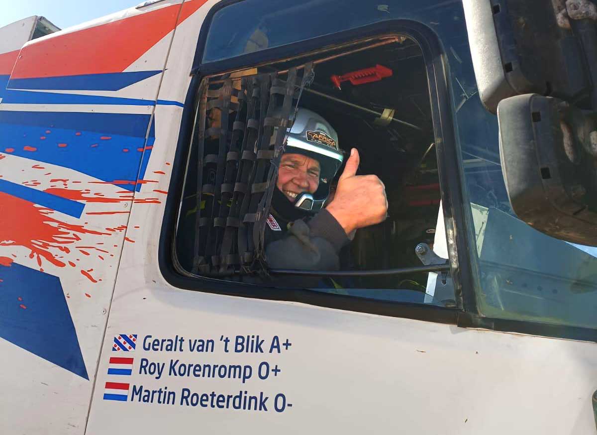Geralt van ' t Blik in de bestuurderscabine van de Dakar-truck. Op de deur de namen van de coureur, navigator, monteur met daarachter hun bloedgroepen. Een verplichte veiligheidsmaatregel. Bij een ernstig ongeval kunnen hulpverleners en medisch personeel direct zien welke bloedgroep de bemanningsleden hebben.