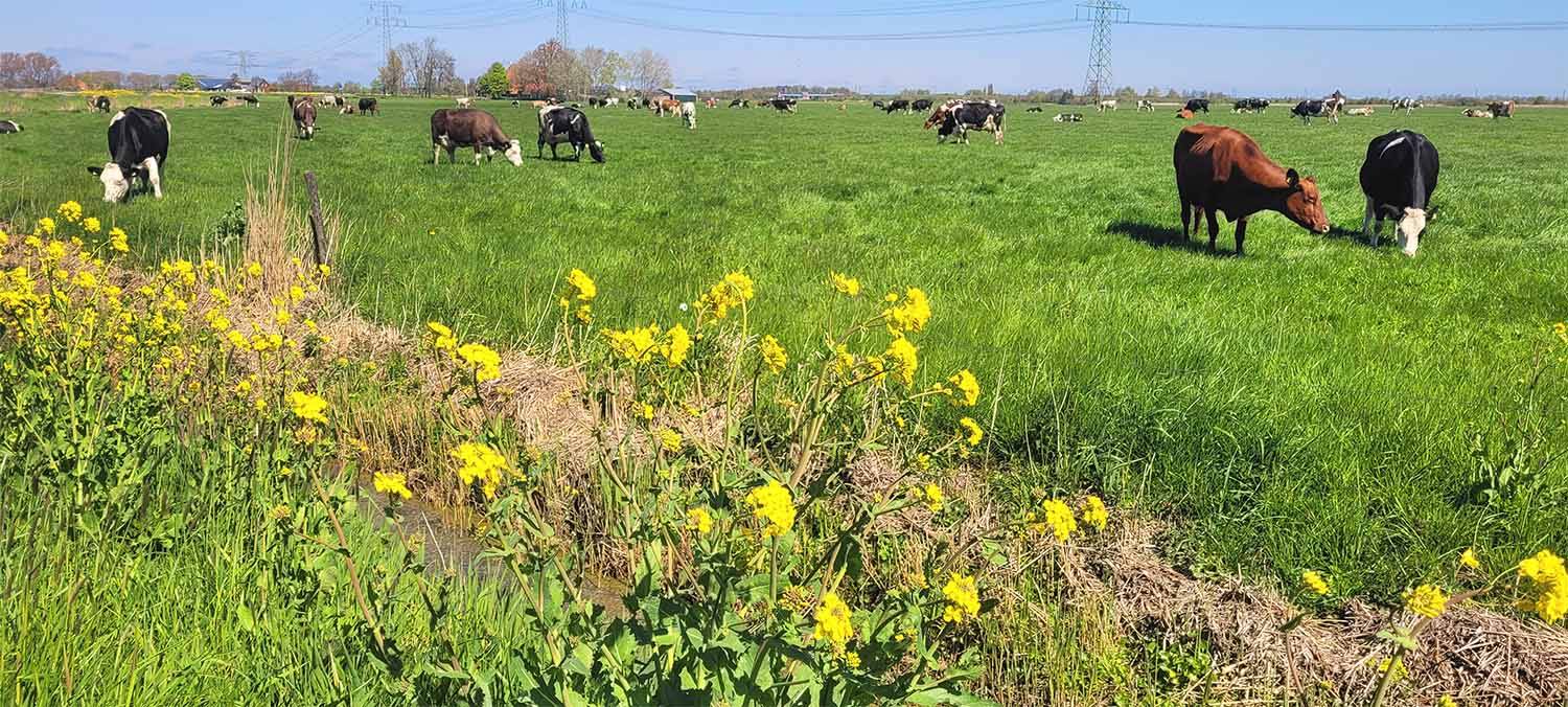 Melkveehouders rond Akkrum hebben hun koeien weer buiten lopen. Met het gele koolzaad en raapzaad in de bermen en de strak blauwe lucht geeft dat een mooi voorjaarsbeeld. Na een lange winterperiode op stal nodigt het mooie weer daartoe ook uit. Op de foto de koeien van melkveehouder Hein Oosterhof aan de Leppedyk langs het Prinses Margrietkanaal.