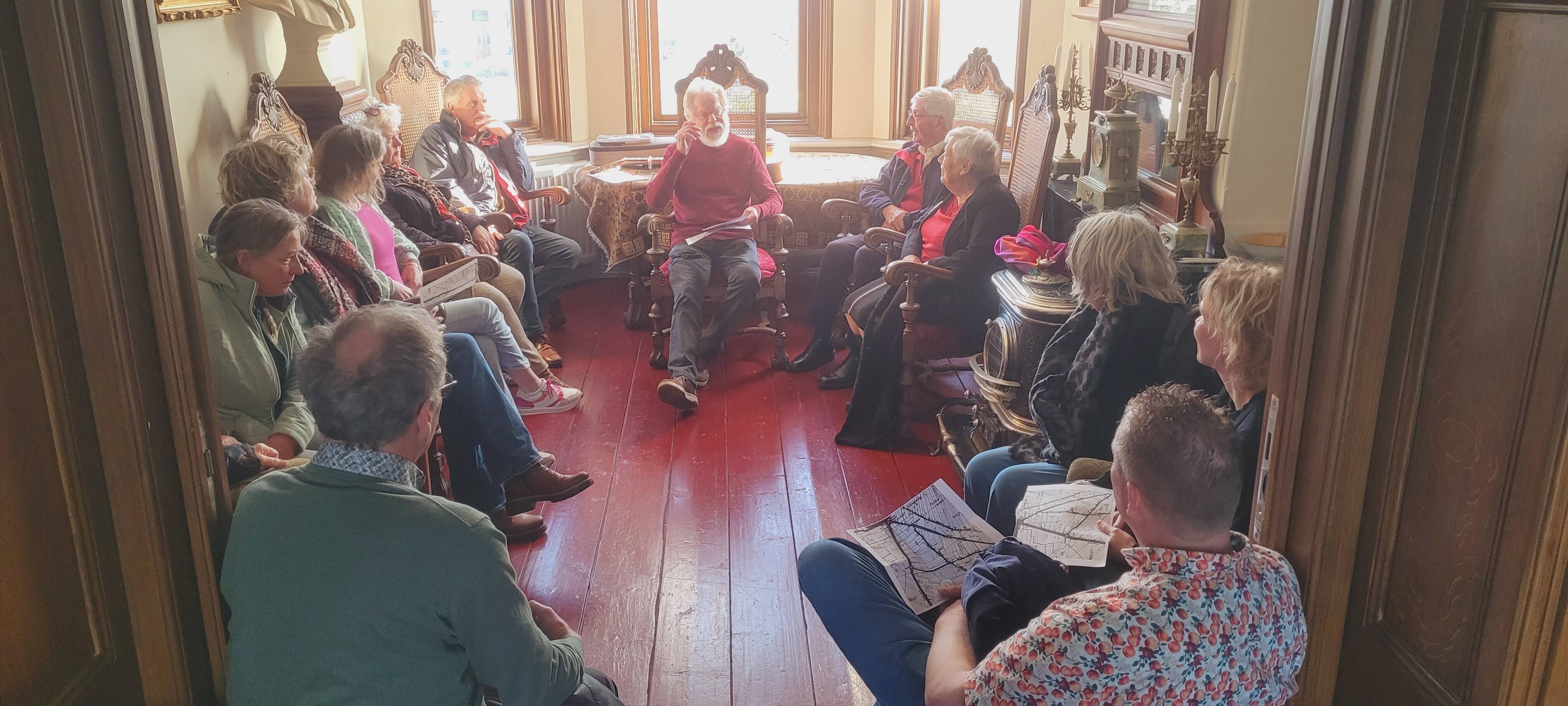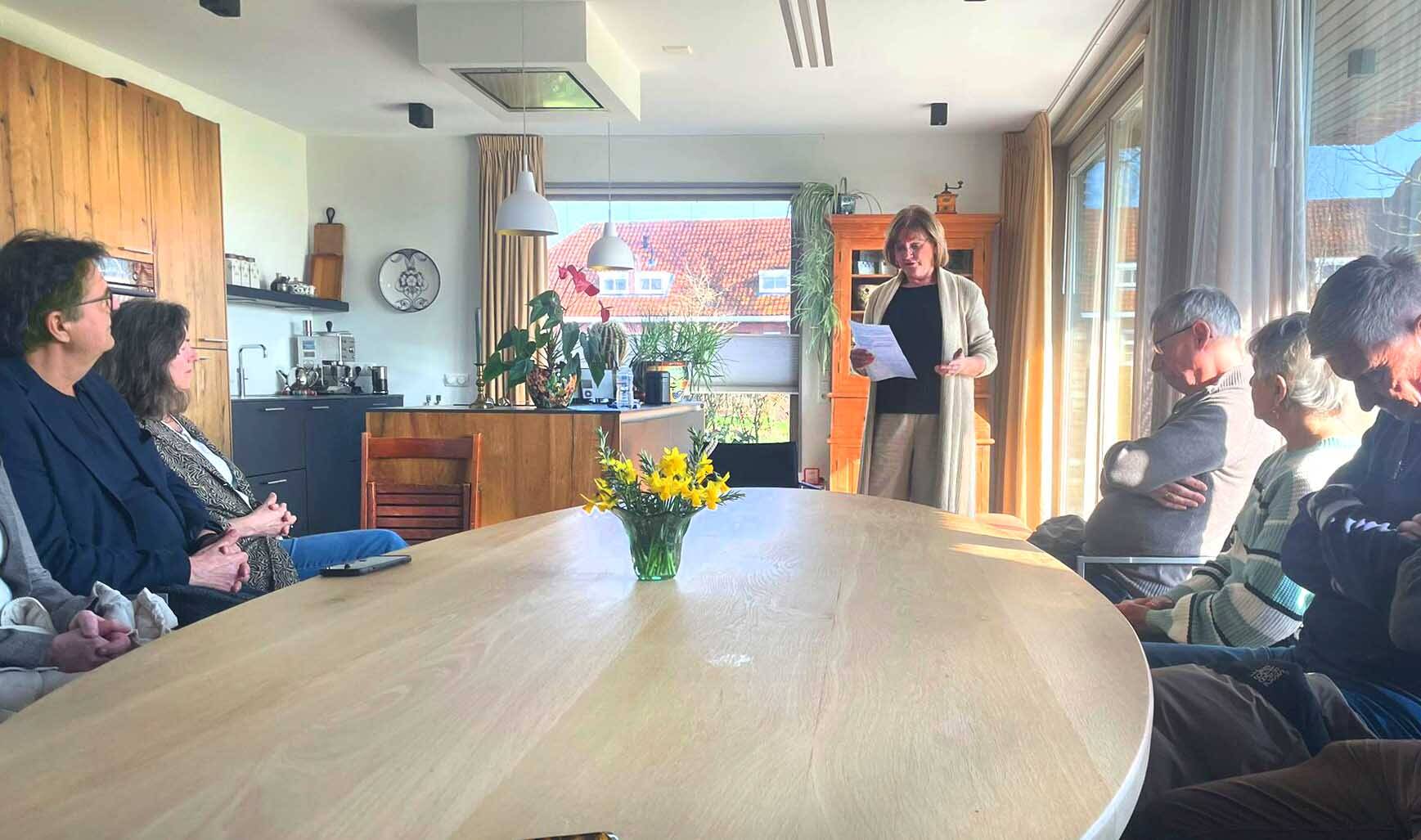 Deelnemers aan de wandeltocht luisteren aandachtig naar het verhaal van Monique Steijger.
