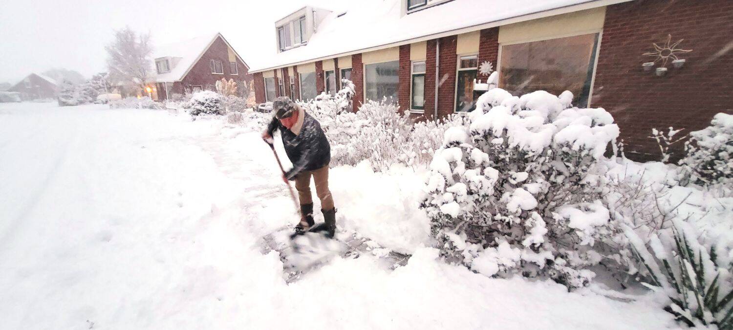 Foto's: Noordoost.nl/Alex J. de HaanZorg voor de buren en de buurtzorg: niet alleen de eigen stoep wordt vrij van sneeuw gemaakt, maar ook die van de buurman en - daar weer naast - de buurvrouw, waar elk moment de thuiszorgmedewerkester kan arriveren.