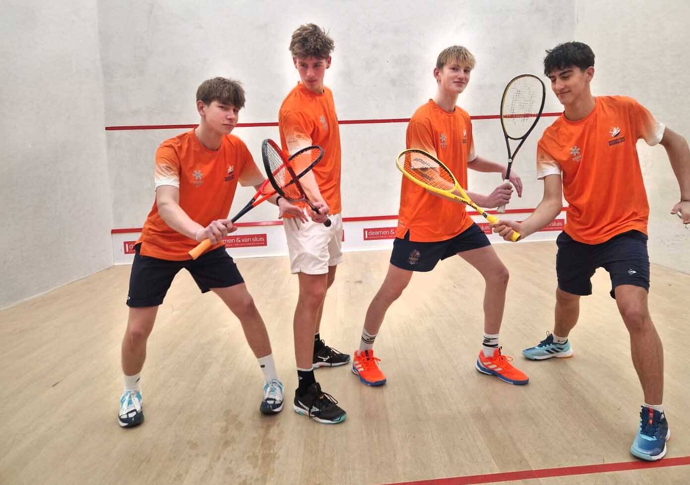 Op weg naar de WK Squash in Canada, van links naar rechts Max Planque, Quinten van Es, Jesper Hempenius en Yago Origel Koers